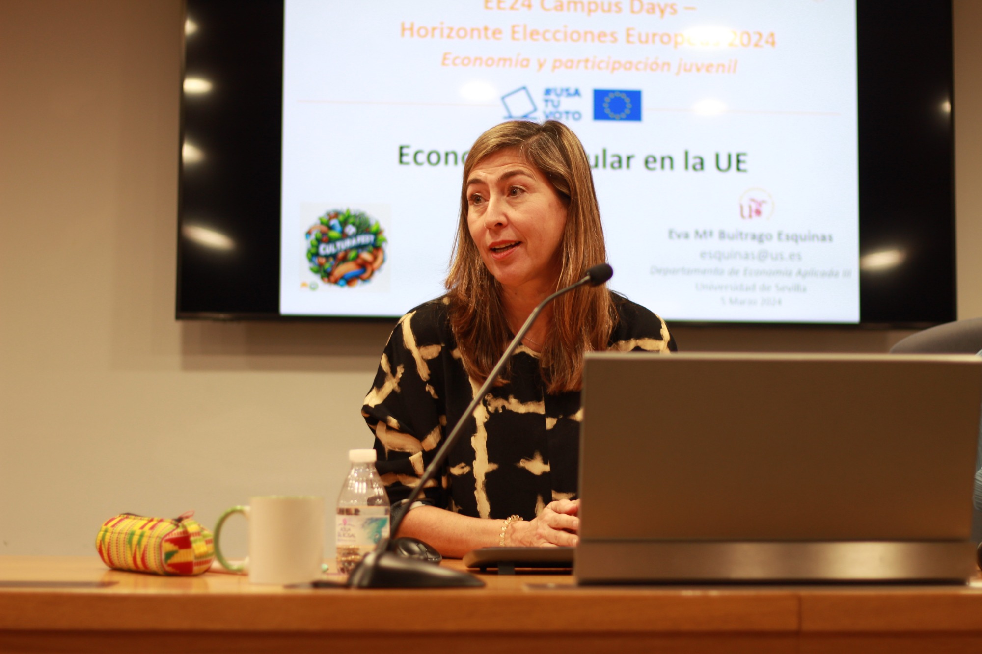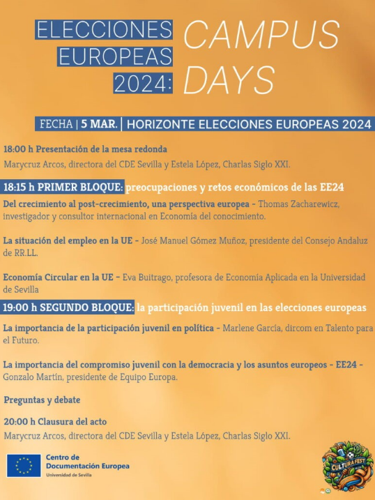En el segundo día del Cultura Fest se celebró la mesa de debate “Horizonte elecciones europeas 2024” en la Facultad de Ciencias Económicas y Empresariales de la Universidad de Sevilla, organizada por el CDE de Sevilla y Charlas Siglo XXI. Presentada por Marycruz Arcos y moderada por Estela López, reunió a expertos para reflexionar sobre los retos económicos y la participación juvenil en los próximos comicios europeos.